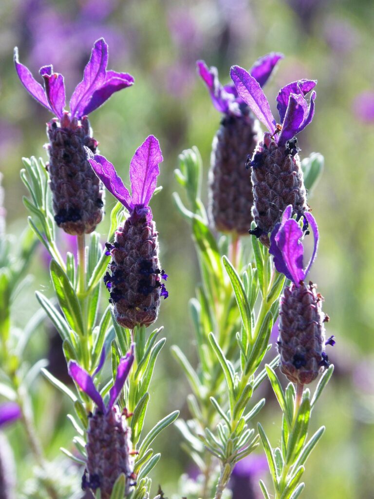 Lavandula dentata: French lavender. It often has fringed leaves but is only mildly fragrant. Bloom time is mid-July – October.
