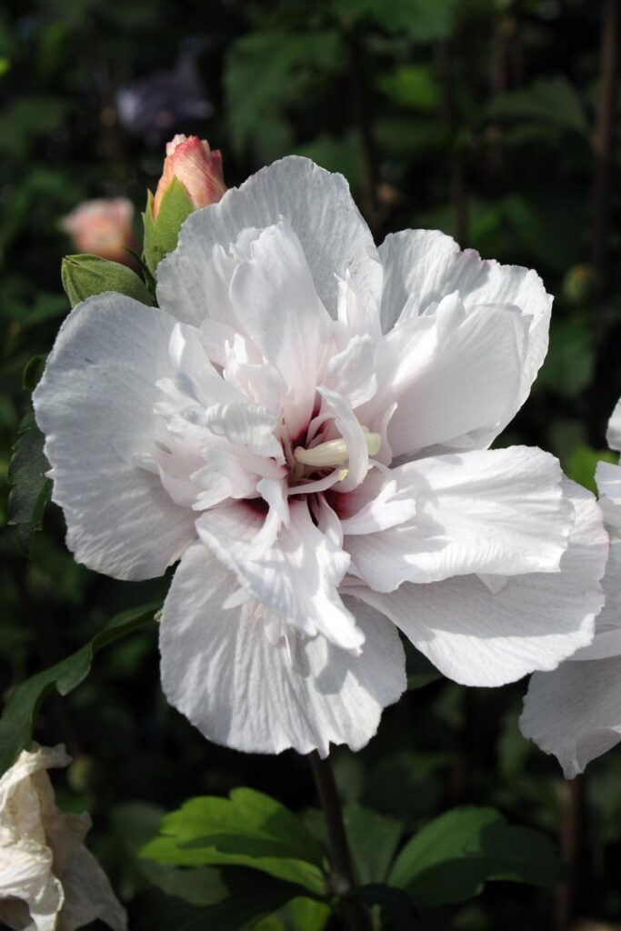- ‘Blue Chiffon’: Double flowers with a purple-blue tinge blooming from mid-summer into fall. It grows 8-12’ with a spread of 6-10’.