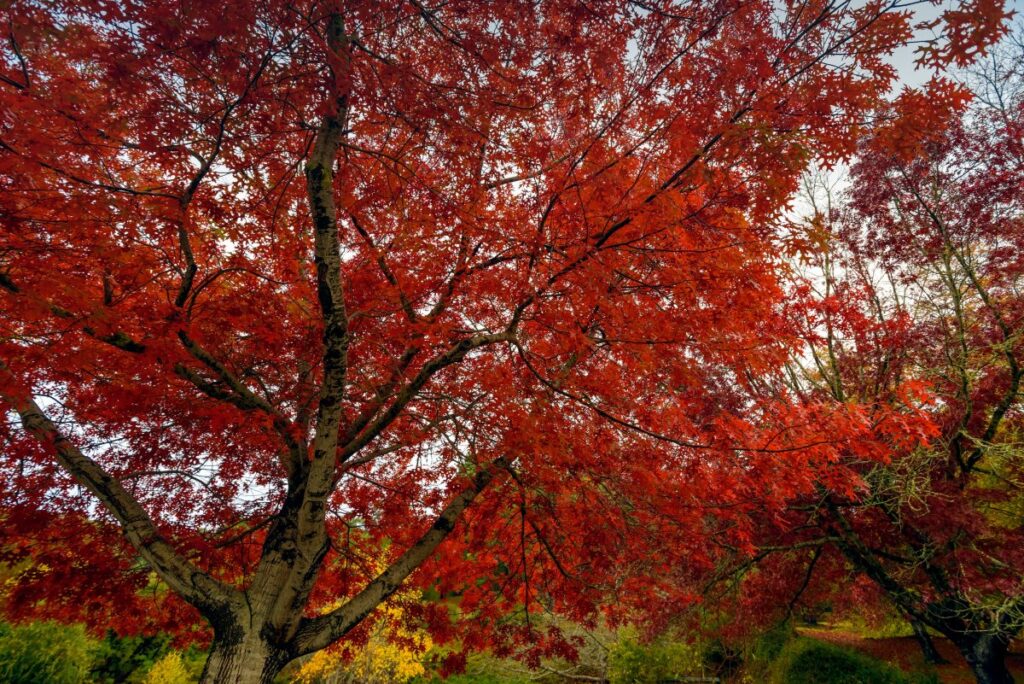For example, red maples are known for producing vibrant scarlet to crimson leaves. The intensity of the red color in these trees is often enhanced by bright, sunny autumn days and cool, but not freezing, nights. Cultivars like ‘October Glory’ and ‘Autumn Blaze’ are especially known for consistent, fiery color that lasts longer into the season. Maples are a diverse group with many species. Red maples turn scarlet, but sugar maples are a bit lighter with more orange.
