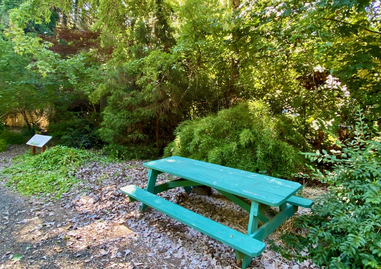 Steve Renquist, OSU Extension horticultural agent (2000-2022), developed an interesting feature in the Hedgerow, using the pleaching technique, on a row of English maples. The side branches of the maples are bent and trained to meet together laterally, creating a flat-planed border which is airy, not dense, allowing breezes to waft through the garden.